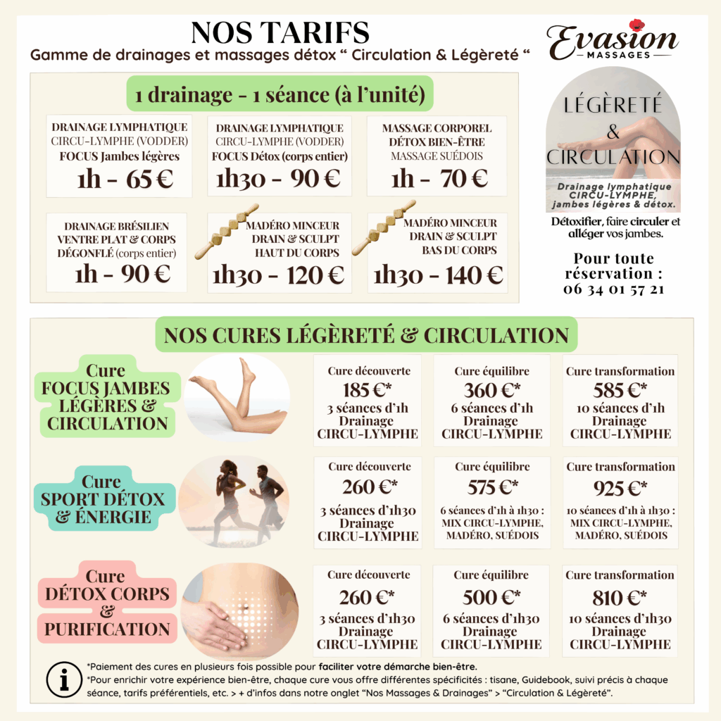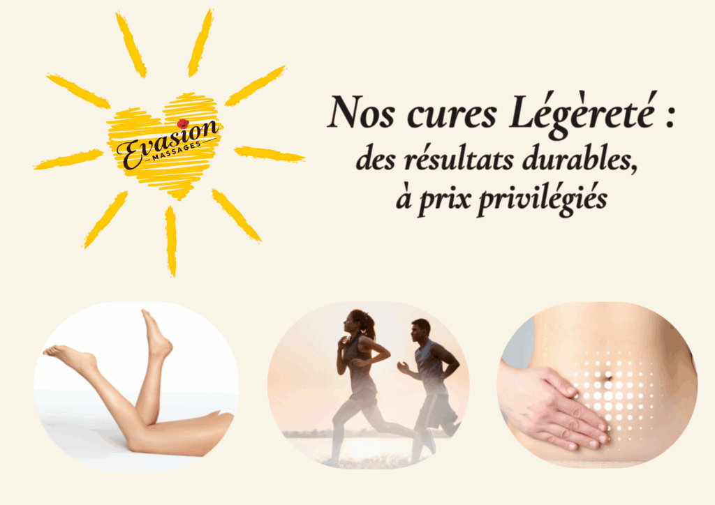 C’est une cure intĂ©rieure, qui rĂ©veille en douceur votre Ă©nergie, allĂšge votre silhouette, apaise l’inconfort et vous reconnecte Ă une sensation oubliĂ©e : celle d’un corps libre et vivant. Nos massages sont proposĂ©s Ă l’UnitĂ© (dĂ©couverte) ou en cures DĂ©tox & Jambes lĂ©gĂšres (au choix), pour retrouver lĂ©gĂšretĂ© et sĂ©rĂ©nitĂ© durablement.