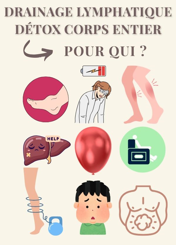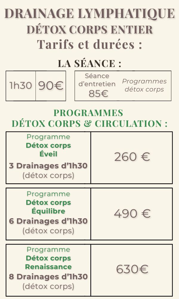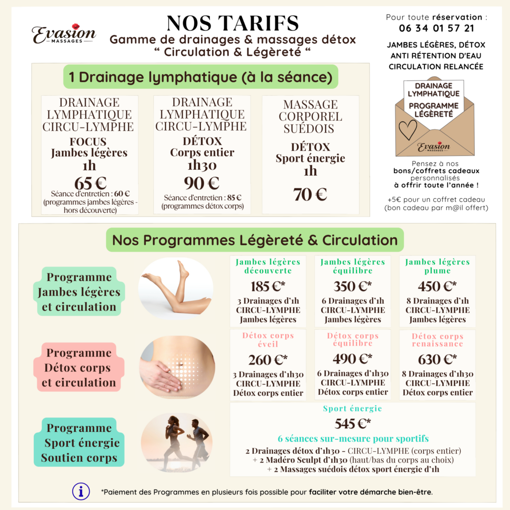 Offrez-vous un véritable soin détox et légÚreté du corps et laissez-vous transporter par les bienfaits du drainage lymphatique corps entier (jambes, ventre, fessiers et visage).