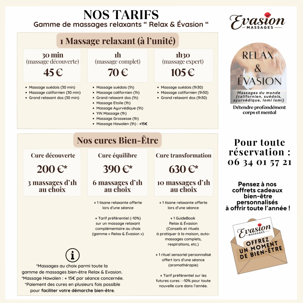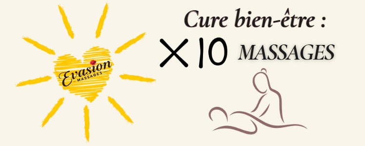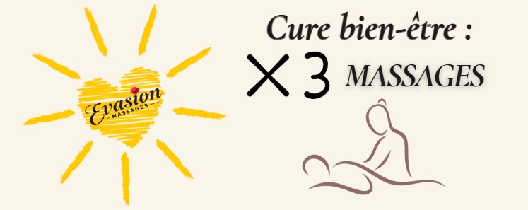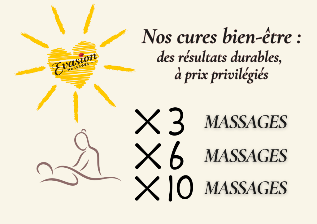 la cure Bien-Être "Relax & Évasion" (3,6 ou 10 massages personnalisĂ©s) vous accompagne vers une transformation durable. En plus, chaque cure vous fait bĂ©nĂ©ficier de tarifs prĂ©fĂ©rentiels.