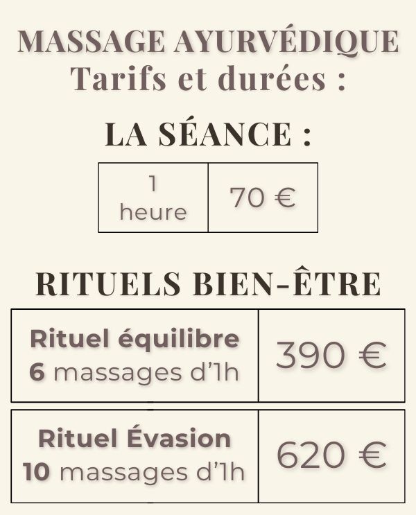 IdĂ©al pour les personnes en quĂȘte d’un mieux-ĂȘtre global, physique et Ă©motionnel ou en perte d’Ă©lan vital, le massage ayurvĂ©dique vous reconnecte Ă votre Ă©nergie vitale et vous aide Ă retrouver une harmonie intĂ©rieure durable.