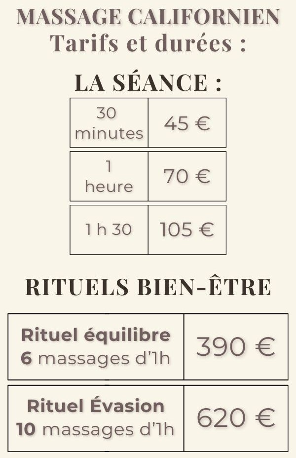 Que vous ayez besoin de relĂącher les tensions du quotidien, de vous recentrer aprĂšs une pĂ©riode de chamboulement Ă©motionnel, ou simplement de vous offrir un moment de bien-ĂȘtre intense, le massage californien vous enveloppera de douceur et vous aidera Ă retrouver apaisement et Ă©quilibre intĂ©rieur.