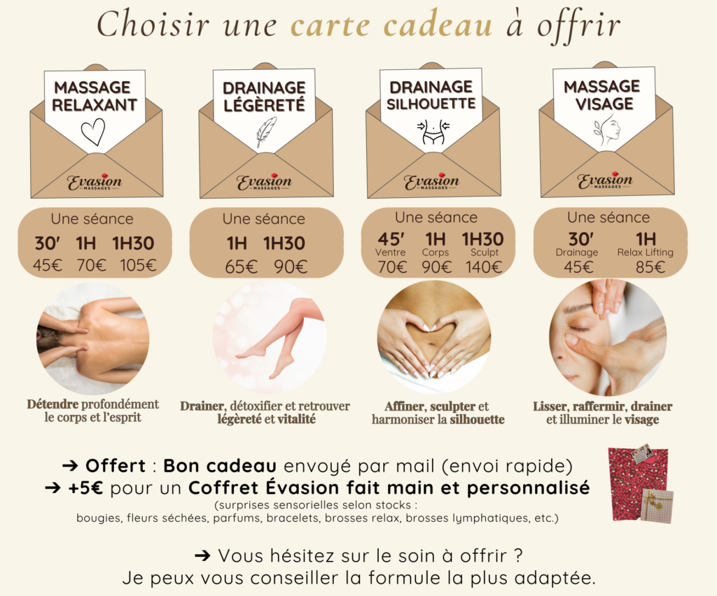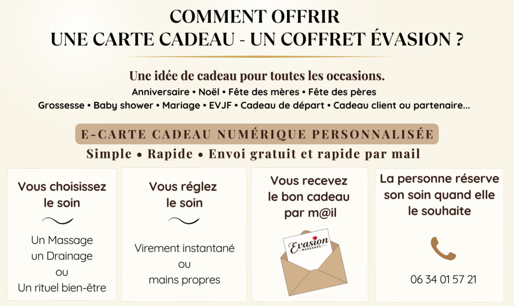 「 MENU 」 ➛ ACCUEIL ➛ QUI SOMMES-NOUS ? ➛ NOS 4 GAMMES BIEN-ÊTRE DE MASSAGES & DRAINAGES : 【 RELAX & ÉVASION 】 【ÉCLAT, VITALITÉ, LIFT VISAGE 】 【 SILHOUETTE SIGNATURE 】 【 CIRCULATION & LÉGÈRETÉ 】 ➛ TARIFS & CARTES CADEAUX ➛ SÉJOURS EN ALSACE ➛ VOS AVIS 👉 Cliquez ici pour offrir ce moment ✨ℹ️ 06 34 01 57 21 👉 Offrir une carte cadeau maintenant 🎁 06 34 01 57 21 👉 Offrir un Coffret Évasion maintenant 🎁 06 34 01 57 21 「 MENU 」 ➛ ACCUEIL ➛ QUI SOMMES-NOUS ? ➛ NOS 4 GAMMES BIEN-ÊTRE DE MASSAGES & DRAINAGES : 【 RELAX & ÉVASION 】 【ÉCLAT, VITALITÉ, LIFT VISAGE 】 【 SILHOUETTE SIGNATURE 】 【 CIRCULATION & LÉGÈRETÉ 】 ➛ TARIFS & CARTES CADEAUX ➛ SÉJOURS EN ALSACE ➛ VOS AVIS 「 MENU 」 ➛ ACCUEIL ➛ QUI SOMMES-NOUS ? ➛ NOS 4 GAMMES BIEN-ÊTRE DE MASSAGES & DRAINAGES : 【 RELAX & ÉVASION 】 【ÉCLAT, VITALITÉ, LIFT VISAGE 】 【 SILHOUETTE SIGNATURE 】 【 CIRCULATION & LÉGÈRETÉ 】 ➛ TARIFS & CARTES CADEAUX ➛ SÉJOURS EN ALSACE ➛ VOS AVIS ♡